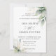 Este convite de casamento chic apresenta lindos arranjos de folhagem verde de aquarela. Personalize-o com seus detalhes de forma fácil e rápida, basta pressionar o botão personalizar para reorganizar e formatar o estilo e a colocação do texto. c) O Feliz Cat Studio