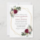Moderno Elegante Aquarela Borgonha Marsala Verde Floral, Dourada Frame Geométrico, Convite à Casamento inclui peões, folhas de eucalipto e outros belos verdes. Burgundy e Black Text. Foto de volta.
