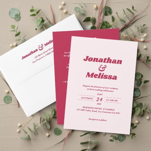 Um convite de casamento retrô único moderno que apresenta um roteiro de tipografia elegante e na moda com a cor da moda viva magenta e tem um Código QR para o site do casamento e todos os detalhes e instruções que seu convidado precisa para que ele possa fazer o rsvp online e ver seu site de casamento para todos os detalhes.