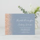 A borda esquerda deste elegante convite de casamento moderno apresenta uma borda falsa de pêssego. O texto personalizável combina manuscrito branco, fontes em copperplate e itálico em um fundo azul empoeirado. O verso apresenta um design de brilho azul empoeirado e cor de pêssego.