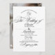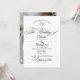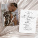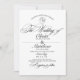 Um convite de casamento moderno, preto e branco, minimalista, com uma elegante fonte manuscrita, com caramujos e um monograma da noiva e do noivo. Clássico e elegante, simples e moderno convite.