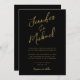 Estes convites personalizados modernos apresentam um roteiro de caligrafia em ouro falso, com letra de mão, sobre fundo preto. Personalize com seus nomes e data de casamento junto com todos os seus detalhes de casamento. Os melhores votos para o seu casamento e casamento! Desenhada por Susan Coffey.
