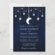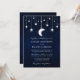 Convite de casamento celestial. Céu azul de água com estrelas e a lua. Luzes de cordas. Bordas feridas. Foto de volta.