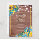 Madeira rústica de campo com girassóis florais amarelos, azuis e verdes, buquê com luzes de cordas brancas e um quadro geométrico, adicione sua foto no verso. Cerimônia do tema do casamento de madeira rusticida.