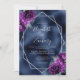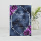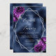 Este elegante convite de casamento moderno apresenta uma estrutura geométrica prateada decorada com buquês florais roxas de ameixa e prata num fundo azul marinho. O texto personalizável combina a escrita manual imétrica de cinzas prateadas, a placa de cobre e as fontes itálicas. O verso oferece espaço para detalhes do casamento, juntamente com um código QR que os convidados podem digitalizar para visitar seu site e RSVP, o que economiza o custo de impressão e envio de cartões RSVP separados.