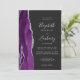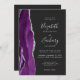 A borda esquerda deste elegante convite de casamento moderno apresenta uma cor d'água roxa, borda agitada com falso brilho prateado. O texto personalizável combina a escrita manual de cinzas prateadas pálidas, fontes copperplate e itálico em um fundo negro e escuro. O verso fornece espaço para detalhes do casamento em um fundo escuro sólido, junto com um código QR que os convidados podem digitalizar para visitar seu site e RSVP, o que economiza o custo de imprimir e enviar cartões RSVP separados.
