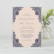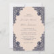 Estes elegantes convites de casamento com rendas florais azuis marinhos em um fundo de champanhe são perfeitos para convidar seus convidados para seu champanhe e festa de casamento rústica azul marinho.