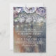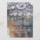 Flores de aquarela - roxo, azul, marinho, violeta, burgundy e plum vintage - colorem o convite de casamento rústico com rendas, madeira e o fio de luzes.