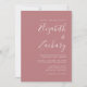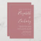 Este simples convite de casamento moderno contém um texto branco sobre um fundo poeirento de rosa. Adicione os nomes da noiva e do noivo na caligrafia de escrita manual do na moda e os detalhes na fonte sans serif. O reverso é uma sombra de rosa sólido empoeirado.