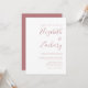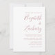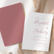 Este simples convite de casamento moderno contém texto empoeirado de rosa num fundo branco. Adicione os nomes da noiva e do noivo na caligrafia de escrita manual do na moda e os detalhes na fonte sans serif. O reverso é uma sombra de rosa sólido empoeirado.