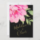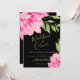 Uma rosa rosa moderna com folhagem verde sobre fundo preto com pontos dourados e texto dourado. Um convite de casamento moderno, chic e elegante. Altere facilmente as informações para o seu próprio design personalizado. Verde preto rosa e ouro. De uma suíte de casamento das designs Finas de Chessie.