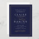 Convite de casamento romântico com script elegante e fonte sofisticada, detalhes do evento em dourado, azul-marinho e branco, moderno e simples, ótimo para casamento formal minimalista, casamento clássico tradicional, casamento simples moderno. Veja todas as peças correspondentes na coleção abaixo.