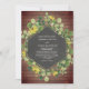 Um convite de casamento com um design botânico com suspiros de olhos negros e verde sobre um antigo prancha de madeira inspirava fundo. Personalize o texto branco sobre design geométrica preta no centro.