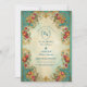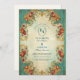 Entra na elegância do eterno com esta vintage teal e design de casamento floral de ouro. Com quadros arquitetônicos de ornamentado, rosas ouros florescentes e padrões de turquesa intrincados, este design é perfeito para casais que adoram uma estética romântica rica. Os tons quentes de vintagem, aliados ao detalhado trabalho de arte floral, criam um sentimento luxuoso e sofisticado, ideal para comemorações formais e de destino.