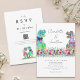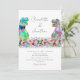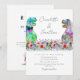 Para casais que amam dinossauros e querem celebrar seu grande dia com um rugido de diversão, este convite de casamento colorido e boêmio com tema de dinossauros e flores silvestres é a escolha perfeita! Com um hilário casal de noivos T-Rex em pé em um vibrante prado de flores silvestres em aquarela, o design se destaca com tons ousados de azul, rosa, roxo, laranja, amarelo e verde. É a combinação perfeita de charme lúdico e beleza natural, criando uma atmosfera caprichosa para sua celebração.