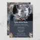Um na moda e um design elegante sobre um fundo azul de ardósia muito escuro apresentando a bela silhueta de aquarela de duas hastes em pé diante de uma lua de cheio escura enquadrada por castanho-macio e cinzas e folhas. São limítrofes em cada extremidade por agulhas de abeto e folhagem de amora bonito no outono. Se você se casar no inverno, tenha uma terra maravilhosa de inverno, queda rústica | no outono ou no casamento do tema floresta, então esta ilustração é perfeita para as suas necessidades.