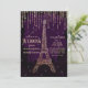 Este convite de casamento elegante e moderno é perfeito para o na moda e o casal de tendências. Ele retrata uma glamourosa torre de ouro falso em Paris, em uma torre roxa violeta e um cenário de cor aquosa com cor de vinho, com estrelas brilhantes brilhantes de brilho e fios brilhantes de brilho. Na parte de trás está o rico popular brilho de Paris, torre de filé, na tenda, roxa, aquarela com estrelas. É mínimo, contemporâneo, chico, artístico e bonito!