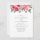 Convite de casamento com o tipo elegante e florais de cor d'água no topo e no fundo. As cores incluem rosa, pincel, vermelho e verde.