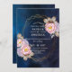 Este é o Marinho Blue Burgundy Dourado Cartão de Convites para Casamento Rosa Blush. Este recurso de cartão é um fundo azul escuro de marinho decorado com uma estrutura geométrica de ouro impressa que é aparada com elementos florais e verdes em tons de marinho, rosa, burgundy e muito mais.