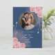 Crie uma primeira impressão inesquecível com este elegante convite para o casamento azul marinho, com delicadas rosas cor-de-rosa-pincel e um design floral brilhante de cor-de-água. O quadro circular de fotos douradas destaca lindamente o casal, acrescentando um toque pessoal ao convite. A mistura refinada de caligrafia e fontes serif melhora a estética clássica, mas romântica, fazer-a perfeita para casamentos modernos, elegantes e eternos. Ideal para casais que procuram um convite sofisticado com um toque floral suave e charmoso. F014