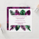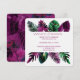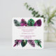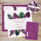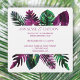 As folhas cor-de-rosa tropicais verdes e silvestres são um convite de casamento versátil para temas de casamento costeiros e de praia. Folhas e samambaias violetas e verdes podem ser facilmente redimensionadas e movidas. Transferir folhas tropicais vibrantes para uma variedade de outras formas de cartas.