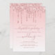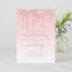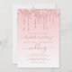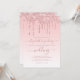 Um design moderno, chic, com um fundo cor-de-rosa com uma borda superior de pingos brilhantes cor-de-rosa. A palavra "casamento" e os nomes dos primeiros casais aparecem em letras minúsculas com traços decorativos no início e no fim, com o texto restante na letra sans serif. O fundo cor-de-rosa e o limite de gotejamento com brilho são repetidos no sentido inverso. (Para guardar as hastes, substitua apenas as letras, deixando os símbolos no lugar.)