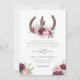Buquê maravilhoso de burgundy, mauve e flores cor-de-água cor-de-rosa decoram duas ferraduras neste belo convite de casamento do país rústico com texto elegante e formal. Casamento floral cor-de-rosa.