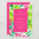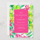 Este convite botânico moderno apresenta um fundo aquoso tropical colorido de flores e folhagem cor-de-rosa e verdes limões quentes. Personalize-o com os nomes da noiva e noiva e outros detalhes do casamento em branco em um retângulo cor-de-rosa. O lado inverso é uma sombra de rosa correspondente. Ideal para um primavera de tema tropical ou casamento de verão!