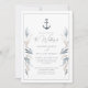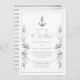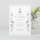 Abraçar a beleza natural do encanto costeiro com este convite de casamento de folhagem e âncora. Adorada com delicados sotaques folínicos nas laterais e um elegante motivo de âncora no topo, esta design capta a essência do romance marítimo. O esquema de cor azul-acinzentado adiciona um toque de sofisticação, enquanto as faixas náuticas atrás evocam elegância eterno à beira-mar.