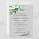 O convite para casamento rústico e elegante apresenta um design floral simples de aquarela com lindas flores azuis, brancas e marfim acentuadas com folhas e pedaços de ouro e verduras de turquesa com fundo de cinza. A introdução apresenta a canção Versa Bíblia de Salomão 3:4, "Encontrei aquela que minha alma ama."