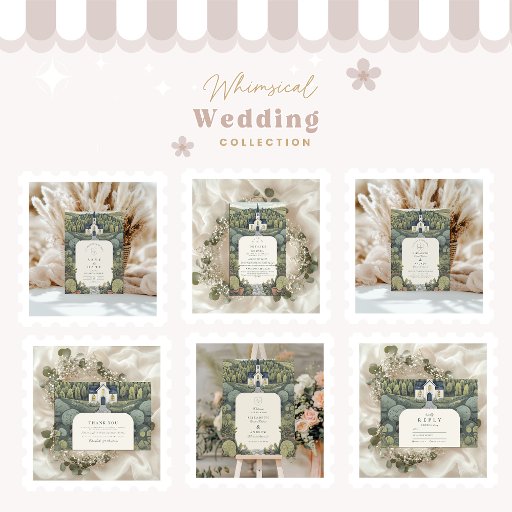 Uma design de casamento, ao estilo de um livro de histórias romântico e caprichoso, com uma capela ilustrada aninhada por colinas rolantes. Esta estética de conto de fadas é perfeita para casamentos no campo ou no jardim, evocando encanto, nostalgia e amor ao eterno.