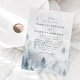 Elegante, convite para casamentos no inverno mostra seus nomes e detalhes de casamento em texto preto contra um fundo de cinzas negras e pinheiros azuis escuros e montanhas. Os convites para o casamento no inverno apresentam um belo roteiro de caligrafia moderna. Os convites de casamento únicos invertem para um fundo azul-d'água marinho escuro. Projetado para coordenar com a nossa coleção de casamento Elegante da Floresta de inverno.