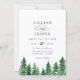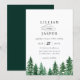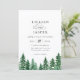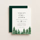 Convite de casamento para a cena da floresta rustica de aquarela. Lindas árvores pintadas em tons de verde em moda, com cores de esmeraldas coordenadas. O convite apresenta uma combinação de estilos de tipografia quic design da caligrafia e do tipo negrito.