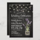 Mergulhe seus convidados no encantador encanto do seu casamento com nossos belos convites. Estes convites de casamento chic no país misturam sem erros um fundo preto de chalkboard rústico com deliciosas luzes de cordas para um toque cativante. A peça central é um jarro de mason arrotado com flores de lavanda roxas, envolto em burlap e gravado com as iniciais do casal. Um modelo de casamento facilmente personalizado adiciona o toque final a estes convites únicos.