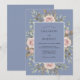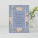 Este design apresenta um cenário azul pervinca sereno adornado com rosas cor-de-rosa desbotadas pintadas e botões delicados. Folhas caprichosas de eucalipto e folhagens dourado-tan fornecem um sentimento exuberante e orgânico para a estética geral. As texturas de aquarela criam uma atmosfera romântica e atemporal perfeita para um evento de primavera ou verão.