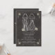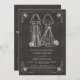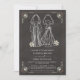 Convite para o casamento da Sra. e Sra. Lésbica, com dois vestidos de casamento feitos à mão sobre um fundo de chalkboard, quadro floral e detalhes em letras de tendências.