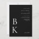 Faça uma impressão dramática e sofisticada com este convite de casamento preto moderno. Projetado com fundo preto em negrito e texto branco nítido, este convite destaca seu monograma em uma fonte serif grande, na parte inferior esquerda. Os nomes dos casais aparecem em uma letra elegante, escrita branca, no canto superior direito, juntamente com os detalhes do casamento, criando uma sensação refinada de equilíbrio e estilo minimalista. O lado inverso apresenta uma borda retangular branca fina, definida a partir da borda para uma aparência limpa e estruturada. Uma versão menor do monograma do casal é centrada no verso para um toque de acabamento polido. Ideal para casais modernos que amam contraste ousado e elegância eterno.