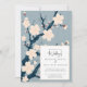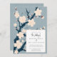 Evoque a essência do encanto da vintagem moderna com este convite de casamento inspirado no Japão. Apresentando um fundo texturizado azul claro adornado com uma árvore de cerejeira estilística. O texto do convite de casamento fora do centro adiciona um toque contemporâneo, misturando elementos modernos e antigos sem problemas.