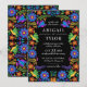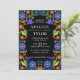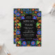 Convite de casamento Colorido Fiesta Mexicana com flores de arte popular contra um fundo preto dramático (você pode alterar a cor para atender ao seu gosto). Ótimo para casamentos com destino no México, casamentos do Cinco de Mayo ou para quem ama a cultura mexicana. Parte da nossa coleção Flores Mexicanas.
