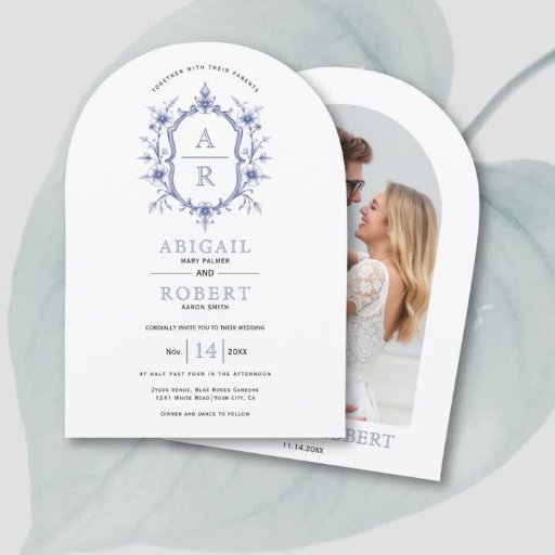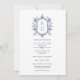 Convite de casamento do monograma floral da vintage elegante azul. Este belamente feito convite apresenta uma crista floral, deliciosamente projetada e inspirada na safra, feita em uma matiz azul. A crista aninhada articamente dentro da crista são as iniciais do casal, criando um monograma personalizado e sofisticado. Abaixo da crista, os nomes dos casais são apresentados elegantemente em tipografia sofisticada e azul, complementando perfeitamente a estética romântica geral do convite. O reverso do convite oferece um fundo azul sólido e calmante, que proporciona um acabamento limpo e coeso a esta memorável manutenção.