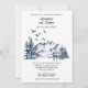 Este convite romântico de casamento apresenta uma cena do noroeste do Pacífico estilo aquarela. Uma imagem das montanhas rochosas cobertas de neve é fotografada a distância. Um veado macho é fotografado perto da frente, entre uma floresta de pinheiros. Um bando de pássaros voa sobre as árvores. É perfeito para um casamento ao ar livre, casamento no inverno, primavera ou qualquer estação.