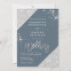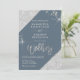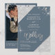 Um convite de casamento no inverno projetado em tons azuis gelados com cantos de efeito de brilho prateado e fontes elegantes de serif e script. A frente mostra os nomes do casal e os detalhes do evento, enquanto o verso inclui espaço para três fotos pessoais, fazer-o simultaneamente bonito e sentimental. Este layout de eterno combina elegância formal com um toque moderno, ideal para casamentos de inverno ou Natal. Perfeito para comemorações formais, eventos de gravata negra, ou um tema clássico de Maravilha de inverno no celeiro.