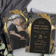 Um convite de casamento sofisticado, com foto de abstrato, em uma falsa argila metálica dourada e preto, com um roteiro moderno de tipografia totalmente editável, sobre uma forma de arco. +++++++++ O convite é adequado para todas as estações em que os casamentos de chic são convertidos. ++++++++++++++ Fácil de personalizar com seus detalhes e fotos no verso.