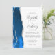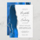 A borda esquerda deste elegante convite de casamento moderno apresenta uma cor azul real de água agada borda com falso brilho prateado. O texto personalizável combina manuscrito, copperplate e fontes itálicas em cinzas de carvão em um fundo branco. O verso apresenta um design de agata real e prateado.
