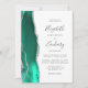 A borda esquerda deste elegante convite de casamento moderno apresenta uma aquarela verde-cerâmica com borda cortada com falso brilho prateado. O texto personalizável combina manuscrito, copperplate e fontes itálicas em cinzas de carvão em um fundo branco. O verso apresenta um mar e um design de agata prateado correspondentes.