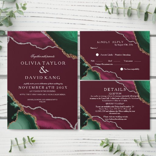Burgundy de casamento de na moda moderno e verde com linha de prata e ouro, escrita clássica, caligrafia elegante e minimalista ( imitação de pó de prata e ouro). Um belo e elegante convite de casamento, simples e moderno.