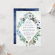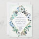 Trabalho de arte de aquarela moderna com uma bela estrutura de flores anêmonas, hydrangea, thistle, eucalipto, folhas. Combinação de fontes elegante. Tema de cor original: azul claro, azul claro, azul profundo, verde claro, bege, névoa, branco. Ondas de cor d'água azul escura na parte de trás. Perfeito para um casamento elegante e moderno, casamento floral.