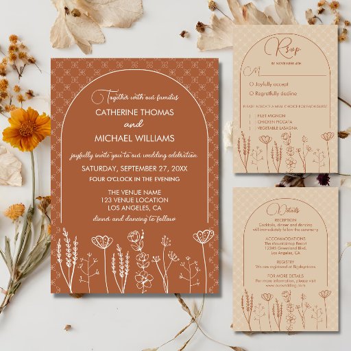 Um tema de casamento de flores silvestres boêmicas é uma escolha perfeita para casais que desejam um dia de casamento caprichoso e romântico. O tema apresenta uma mistura de elementos boêmicos e rústicos, sendo as flores silvestres o principal ponto focal. O uso de tons de terra cria uma atmosfera quente e convidativa. Esse design incorpora uma variedade de flores nativas da área, criando um aspecto colorido e orgânico. Com suas delicadas espirais e florescimentos, a caligrafia dessa design acrescenta a ela um sentimento romântico e caprichoso. Esta design de casamento de flor silvestre boêmica é uma bela escolha para aqueles que querem uma atmosfera única e encantadora para a sua celebração de casamento.