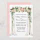 Cartão de Convite para Casamento Floral de Cor Rosa-de-Vidro-Vidro Elegante, com lindas rosas cor-de-rosa e rosas brancas. O arco da copa do casamento da madeira inclui vegetação botânica.