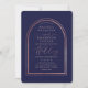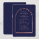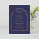 Este convite de casamento moderno e simples é perfeito para o casal contemporâneo. Ele apresenta uma falsa borda de arco duplo impressa rosa dourada e uma tipografia de script de assinatura manuscrita sobre um simples fundo azul marinho. É minimalista, elegante e chique; o design perfeito para sua ocasião especial. ***NOTA DE DESIGN IMPORTANTE: Para qualquer solicitação de design personalizada, como produtos correspondentes, alterações de cor, mudanças de posicionamento ou qualquer outra solicitação de alteração, envie uma mensagem ao designer. Você pode até enviar uma solicitação para um design completamente personalizado e novo.